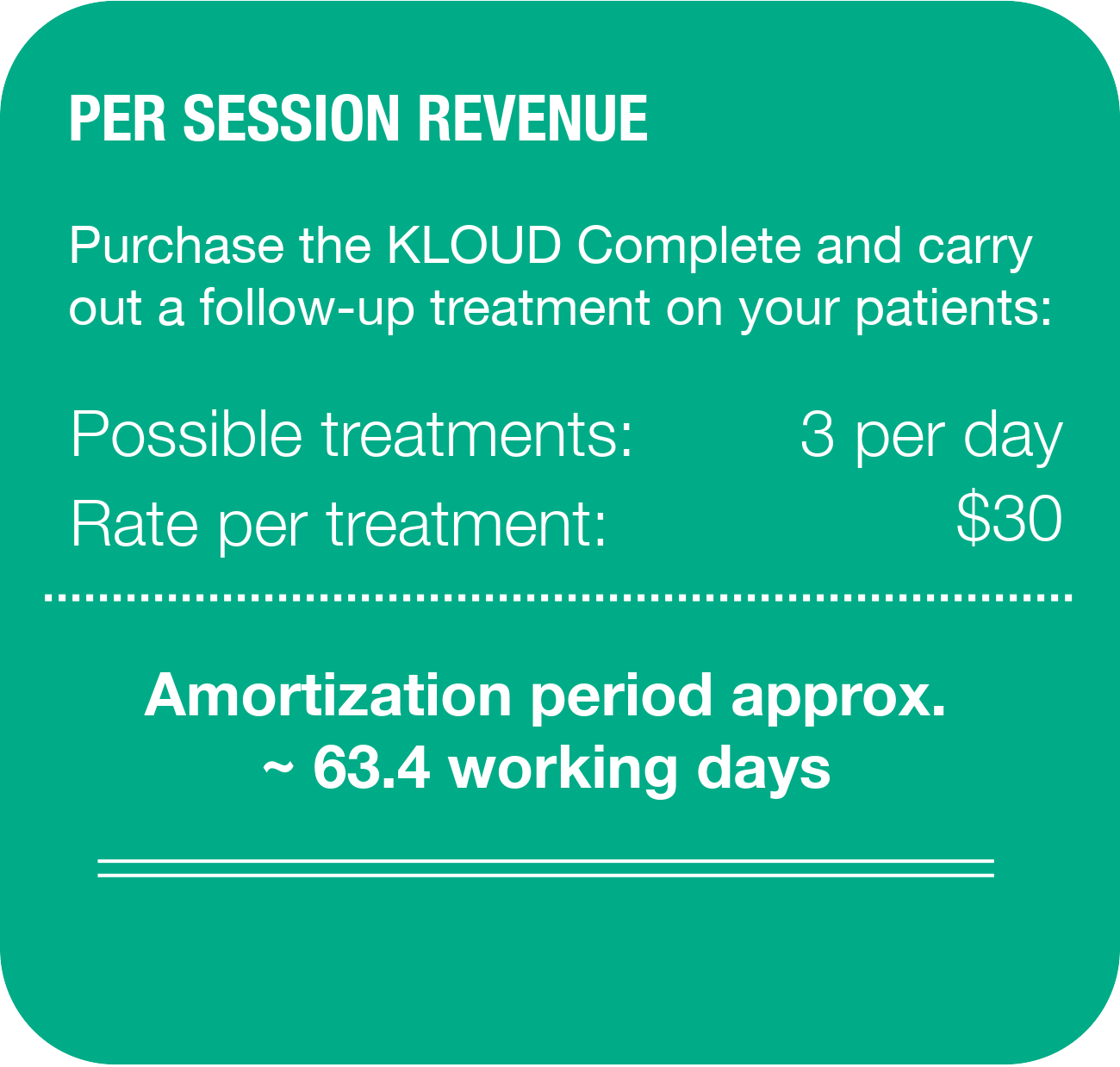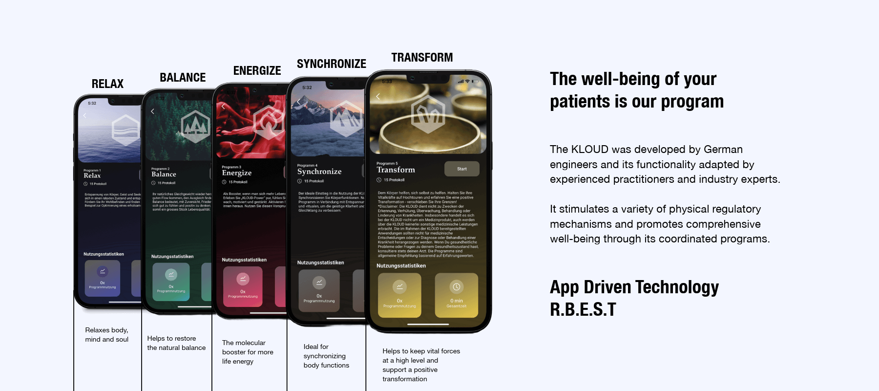 Your health and well-being deserve the best. Experience the power of the future with KLOUD. Indulge yourself with 50 times the potential. Our latest generation KLOUD magnetic field applicator breaks all records with an activation potential of 23,040,000 - that's a whopping 50 times stronger than our competitor's products, which are only at maximal 450,000. Characterized by a form of stimulation that covers practically all previous forms, the wave technology of the KLOUD is based on a special mutual superposition of several pulsed intensity sequences, each varying in time.